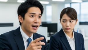 職場でのお節介な人の末路や特徴を象徴するシーン。一方的な干渉に困惑する様子を通して、うざいと感じる心理と孤立する未来を表現している。